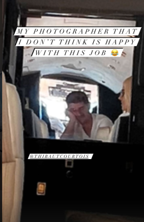 Adevărata stare de spirit a fost reflectată însă, la propriu, de Thibaut Courtois. Belgianul a fost surprins mai mult decât plictisit în oglinda din spate, astfel că frumoasa nevastă de fotbalist a fost nevoită, apoi, să facă o glumiță pentru „a se scoate” în fața urmăritorilor săi. „Fotograful meu nu cred că e încântat de misiunea lui”, a scris blonda.