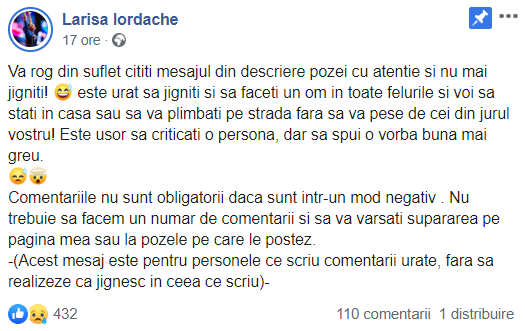 Acest mesaj este pentru personele ce scriu comentarii urâte, fără să realizeze că jignesc în ceea ce scriu”, a scris Larisa Iordache, pe pagina ei de Facebook.