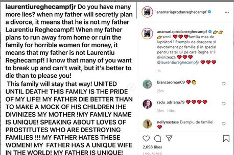 „Familia aceasta va sta unita până la moarte! Vorbind despre prostituate…tatălui meu nu-i plac asemenea femei. Tatăl meu are o femeie unică în lume! Tatăl meu este unic! Tatăl meu nu ar lua din banii familiei pentru a cheltui pe alte femei” a scris băiatul de 12 ani pe rețelele sociale, iar Anamaria Prodan i-a comentat: „Iubitul meu drag, la noi este simplu! Cine minte, trădează, dezonorează, plătește fff scump totul! Tata nu are amante, tata nu fură banii familiei să-i dea la astfel de femei”.