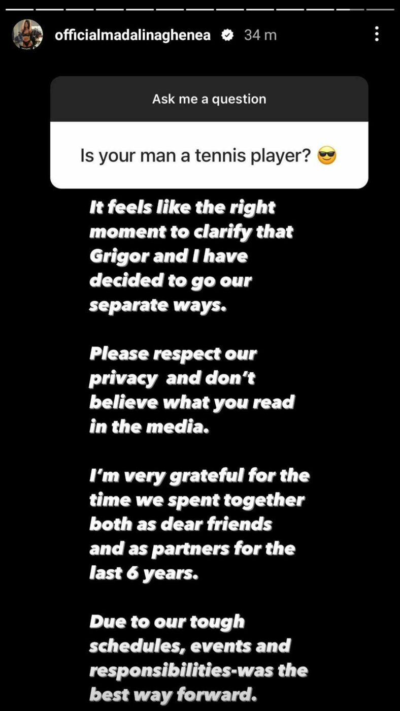 Mădălina Ghenea a transmis că ea și Grigor Dimitrov nu mai formează un cuplu, cerând, totodată, să le fie respectată intimitatea.