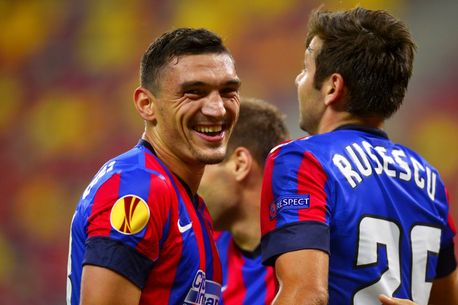Adrian Popa, Claudiu Keseru si Raul Rusescu, de la Steaua Bucuresti, se bucura de un gol marcat, in meciul cu Aalborg, din prima etapa a grupelor Ligii Europa, in Bucuresti, joi, 18 septembrie 2014. BOGDAN IORDACHE / MEDIAFAX FOTO