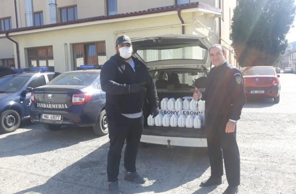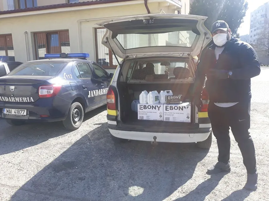 Vlăduț Simionescu a făcut prima oprire la Inspectoratul de Jandarmi Județean Iași, unde a donat mănuși sanitare și dezinfectanți.