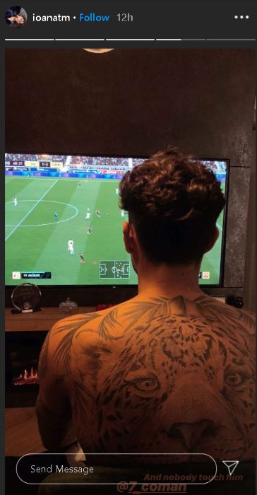 Ioana l-a surprins pe Florinel Coman în timpul unui meci de FIFA, în imagine observându-se și capul uriaș de leu tatuat pe spatele jucătorului de la FCSB. Peste imagine, tânăra a scris un mesaj, făcând referire la desenul de pe corpul fotbalistului: „Nimeni nu-l poate atinge”.