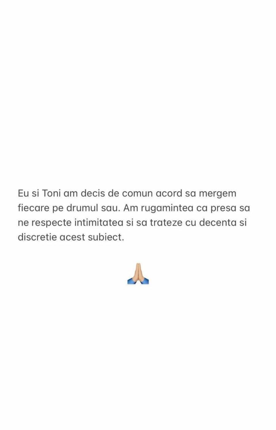 Omul de afaceri a confirmat primul despărțirea, chiar dacă în primă instanță negase totul: „Am hotărât de comun acord cu Simona să ne despărțim! Nu mai insistați, este ultima mea ieșire publică…. De restul se vor ocupa avocații în cel mai civilizat mod cu putință. Mulțumesc de înțelegere!”, a spus Toni Iuruc, potrivit Fanatik.
