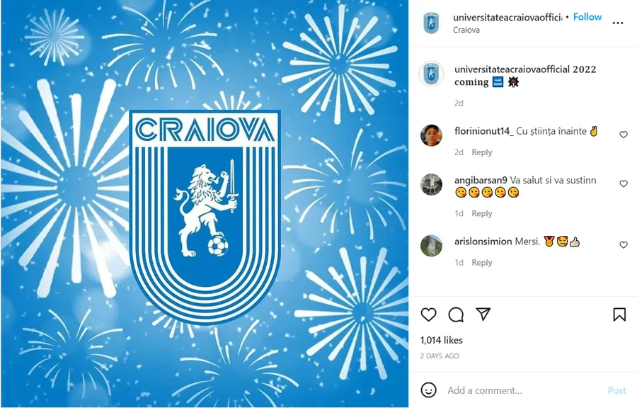 Universitatea Craiova a anunțat sosirea noului an printr-o fotografie cu stema clubului înconjurată de artificii, însoțită de mesajul „2022 coming”: