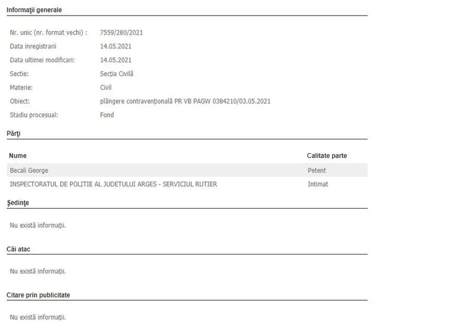 Becali a făcut contestație la data de 14 mai. Dovada e pe portalul Instanțelor de Judecată.