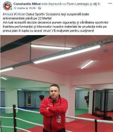 Sălile clubului de K1 Scorpions Iași au fost și ele închise. ”Am închis și noi sălile. Cea din Iași și din alte localități. Toți colegii mei au sistat antrenamentele până se deschid școlile. Inițial până pe 23 martie, dar probabil pauza se va prelungi. Nu e plăcut, dar trebuie să respectăm aceste reguli”, a declarat Mihai Constantin, președintele și antrenorul clubului Scopions Iași.