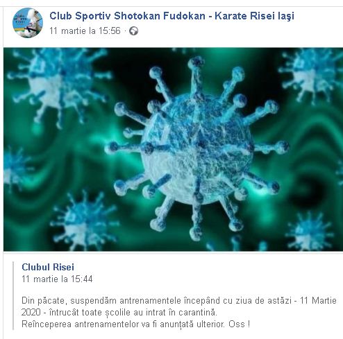 Și cluburile de karate tradițional au suspendat antrenametele. ”Din cauza coronavirusului, antrenamentele se suspendă până la noi reglementări. Oss!”, a anunțat clubul de karate tradițional ENPI Iași, condus de Sensei Constantin Adăscăliței. Exemplul a fost urmat de clubul RISEI. ”Din păcate, suspendăm antrenamentele începând cu ziua de astăzi, 11 Martie 2020, întrucât toate școlile au intrat în carantină. Reînceperea antrenamentelor va fi anunțată ulterior”, a anunțat clubul RISEI, condus de Sensei Marian Bejenaru.