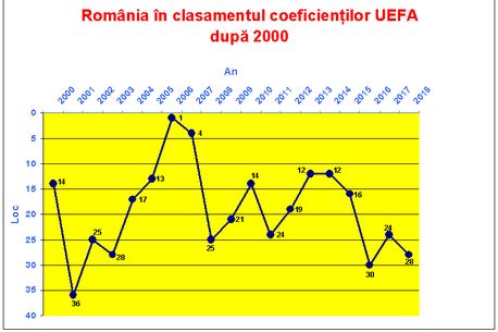 O altă observație interesantă care se desprinde din graficul pe care-l publicăm alăturat este că șocul ultimilor trei ani a fost mai mare chiar decât cel suferit de fotbalul românesc la începutul acestui deceniu, în timpul gravei crize economice mondiale. Cel mai greu moment al acelei perioade a fost 2011, când rezultatele echipelor românești în cupele europene ne-au plasat pe locul 24. Acum, locul 24 (ocupat în 2017) reprezintă vârful de performanță al ultimilor trei ani.