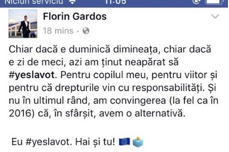 Florin Gardoș, campion al României cu FCSB la fotbal, a publicat o poză cu el introducând buletinele de vot în urnele cu rezervate referendumului pe tema Justiției, alături de mesajul: „Chiar dacă e duminică dimineață, chiar dacă e zi de meci, azi am ținut neapărat să #yeslavot. Pentru copilul meu, pentru viitor și pentru că drepturile vin cu responsabilități. Și nu în ultimul rând, am convingerea (la fel ca în 2016) că, în sfârșit, avem o alternativă.