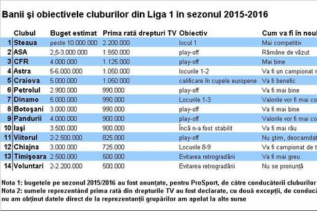 Din perspectiva bugetului, Steaua domină și noua ediție a Ligii 1. Deși în scădere financiară față de anii trecuți, echipa lui Gigi Becali păstrează o alonjă comparativ cu restul participanților, suma avansată de președintele Valeriu Argăseală fiind dublă față de principala urmăritoare, Astra Giurgiu. După „roș-albaștri”, următorul „etaj” e ocupat de trei echipe care anunță aproximativ același buget: Astra, Craiova și Dinamo. S-ar părea că, în acest moment, suma de 5.000.000 de euro este suficientă ca să emiți pretenții la podium în Liga 1.