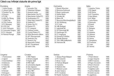 Din cele 14 echipe existente acum în Liga 1 la fotbal, 9 sunt înființate după anul 2000 și numai două, Dinamo și CFR Cluj, pot fi regăsite și în ediția din urmă cu 40 de ani a competiției. Prin comparație, în Anglia, toate cele 20 de cluburi din Premier League au peste 100 de ani vechime, iar 12 dintre ele puteau fi găsite în prima ligă din ediția 1975-1976. În Ungaria, 9 echipe din totalul de 12 s-au înființat înainte de 1920, iar 9 dintre cluburile ediției 2015-2016 jucau în prima ligă și acum patru decenii.