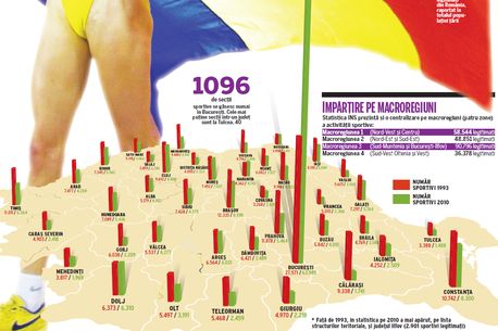 În România, centrele sportive încep să se concentreze în jurul orașelor cu nivel de trai mai ridicat. Cel puțin așa reiese din statistica pe anul 2010, în care Bucureștiul adună mai bine de 25 la sută din totalul sportivilor legitimați din țară. Capitala are cel mai mare număr de locuitori, aproape două milioane (10 la sută din total), contribuie cu aproape 20 la sută la PIB-ul țării, dar la sport depășește toți ceilalți indici. Uluitoare este și progresia numărului de practicanți din București: la începutul anilor 90, cel mai mare oraș al țării avea înregistrați 27.571 de sportivi. Acum, numărul lor a crescut de două ori și jumătate. „E pe undeva normal”, spune fosta mare atletă Gabriela Szabo.