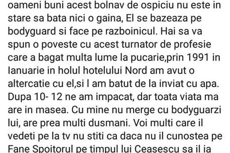 Dupa 10- 12 ne-am impacat, dar toata viata ma are in masea. Cu mine nu merge cu bodyguarzii lui, are prea multi dusmani. Voi multi care il vedeti pe la tv nu stiti ca daca nu il cunostea pe Fane Spoitorul pe timpul lui Ceasescu sa il ia sub aripa lui, manca bataie zilnic. Sunt multi oameni care pot confirma tot ce am scris. Omul e dus rau nu il mai bagati in seama pe bolnav”, a postat Tudor Dumitru pe pagina personală de Facebook.