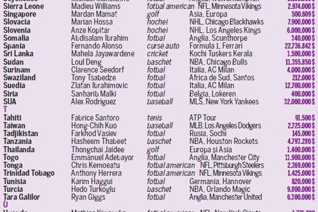 ESPN a strâns datele despre câștigurile sportivilor din aproape 200 de țări și l-a extras pe cel mai bine plătit din fiecare. 17 sporturi sunt reprezentate, fotbalul dominând clar, urmat de sporturile americane, cursele auto și golf. Manchester City e campioană la plătit sume uriașe.