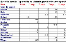 Pe plan intern, cea mai abruptă scădere s-a constatat la Fortuna, care a început prin a oferi cota 9,5 pentru victoria gazdelor și a sfârșit luni, la ora meciului, cu exact jumătate din oferta inițială: 4,75. Nu departe au fost alți operatori importanți pe piața românească. Unibet a deschis oferta pe 1 septembrie, cu cota 8. În dimineața meciului cota coborâse deja la 5,2, iar până după-amiază ajunsese la 4.75. NetBet a deschis, pe 2 septembrie, cu cota 8. În dimineața meciului se ajunsese la 5.65, iar la startul jocului era cota 5.