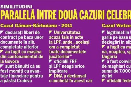 Scandalul Găman-Bărboianu, fotbaliști de la Universitatea Craiova declarați liberi de contract în baza unor documente în alb completate ulterior, are un precedent tocmai în perioada interbelică, acuzați fiind tot funcționarii federali! În 1928 a existat un caz – cel al lui Rudolf Wetzer – foarte asemănător cu povestea care a răvășit fotbalul românesc în 2011. Atunci, președinte era timișoreanul Aurel Leucuția, acum – bucureșteanul Mircea Sandu. Ceea ce arată că, indiferent din ce zonă ar fi șefii și în ce perioadă s-ar petrece, metodele de deturnare a jucătorilor și obișnuința de a umbla cu acte dubioase au o tradiție îndelungată.