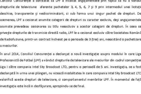 „(…) În anul 2014, Consiliul Concurenței a declanșat o nouă investigație asupra modului în care Liga Profesionistă de Fotbal (LPF) a vândut drepturile de televizare ale meciurilor din cadrul competiției Liga I către compania Intel Sky Broadcast LTD, pentru o perioadă de 5 ani. Investigația, ce a fost declanșată în urma unei plângeri, nu vizează modalitatea în care compania Intel Sky Broadcast LTD valorifică aceste drepturi de televizare, ci comportamentul membrilor LPF. În momentul de față investigația este încă in desfășurare, apropiindu-se de final”, se menționează în adresa trimisă pe adresa ProSport de Consiliul Concurenței.