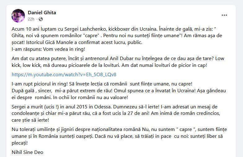 Sergei a murit (ucis!) în anul 2015, în Odessa. Dumnezeu să-l ierte! I-am adresat un mesaj de condoleanțe și chiar mi-a părut rău, că a fost ucis la 27 de ani! Am inimă de român credincios, care știe să ierte! Nu tolerați umilințe și jigniri despre naționalitatea română. Nu, nu suntem «capre», suntem ființe umane și în România sunteți oaspeți. Dacă nu vă place, să trăiți în pace cu noi: sunteți liber să plecați! Nihil Sine Deo” e mesajul lui Daniel Ghiță postat pe pagina sa de Facebook.
