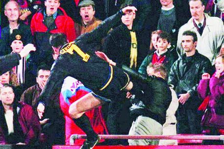 Dar temperamentul vulcanic al francezului nu putea să nu iasă din nou la rampă. Pe 25 ianuarie 1995, într-o deplasare banală la Crystal Palace. Cantona plecase mai devreme la vestiare, după ce l-a lovit cu cotul pe Shaw. În drum spre tunelul care făcea legătura dintre teren și cabine s-a petrecut incidentul care i-a marcat cel mai mult cariera lui Eric. La 9 fix, totul s-a schimbat: „S-a aruncat cu ambele picioare într-un suporter care îl înjurase”. Imaginile rulau continuu pe ecranele televizoarelor. Șase luni de suspendare și prezența în fața unui judecător, care avea să-i aducă 120 de ore de muncă în folosul comunității.