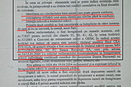 Pagina 20 a motivării ICCJ la sentința din 3 decembrie 2014: „Înalta Curte a constatat că sunt îndeplinite condițiile pentru a constata existența relei-credințe la înregistrarea mărcii” și „dispune anularea în tot a înregistrării mărcii”. Azi, la 4 ani după această sentință, FRF și LPF încă refuză să o pună în practică. În mod surprinzător, nici conducerea clubului Steaua și a MApN nu s-a grăbit, până acum, să își apere dreptul câștigat în instanță