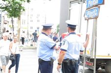 Momentul în care polițiștii (ei înșiși cu sticle de apă Azuga în mână) chemați de jurnaliști îi cer explicații pesedistului care face bișniță cu apa pe care ar fi trebuit s-o distribuie gratuit. FOTO: Mihai Boeru