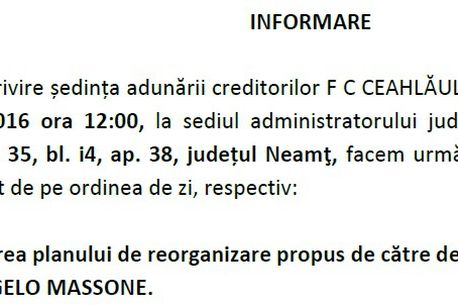 Caracterul amuzant al acestui demers a fost dat de faptul că planul de reorganizare propus de către compania care se ocupă de insolvența Ceahlăului a fost aprobat în cadrul unei ședinte la care au fost invitați 137 de persoane într-un apartament de bloc din Piatra Neamț.