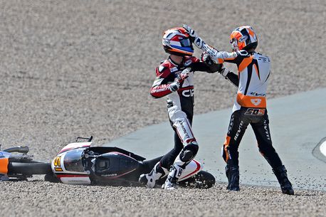 CASCA CERE PUMNI. Motociclismul nu este un sport de contact. Sau cel puțin asta credeam până acum. Bryan Schouten și Scott Deroue, piloți la clasa Moto 3 în motomondialul de viteză, s-au luat la bătaie după un accident suferit pe circuitul de la Sachsenring