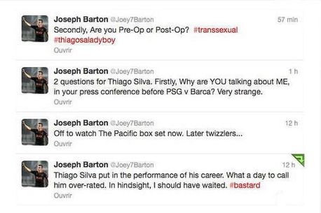 Joey Barton, fostul jucător al lui Olympique Marseille, este foarte activ pe Twitter, platformă pe care își reglează des conturile cu „inamicii” săi. Ultima gafă: s-a luat de fizicul brazilianului de la PSG, Thiago Silva pe care l-a numit transsexual. „Am două întrebări pentru Thiago Silva. Prima: De ce vorbești tu despre mine în conferința de presă de dinaintea meciului PSG-Barca? A doua: esti pre-operat sau post-operat? Transsexual. ThiagoSilva, un bărbat doamnă”.