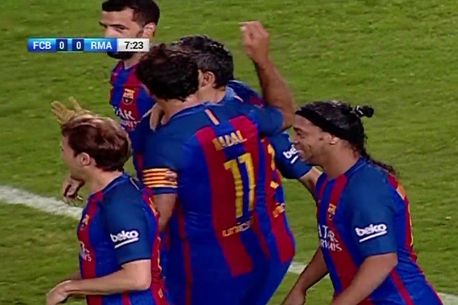 Punct ochit, punct lovit. Ronaldinho a strălucit în Beirut în partida amicală El Clasico al Legendelor. Superstarul brazilian a făcut spectacol pe teren și a fost „vinovat” pentru toate cele 3 goluri marcate de Barcelona. 3 assist-uri superbe și echipa blaugrana a repetat scorul obținut de gruparea antrenată de Luis Enrique (23 aprilie) pe Santiago Bernabeu, 3-2.