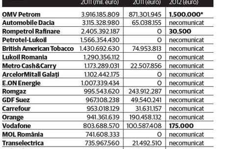 Gică Hagi vorbește de ceva timp despre necesitatea implicării firmelor mari din România în finanțarea sportului. „Fac afaceri aici, trebuie să întoarcă o parte din bani în sport, în sănătatea oamenilor. Așa este peste tot în lume”, spune fostul mare fotbalist. Cu cât contribuie firmele mari la bunăstarea sportului? Ziarul Financiar a încercat să afle răspunsul, chestionând principalii „jucători” de pe piață, referitor la anii 2011 și 2012. Concluzia: 12 din cele mai mari 20 companii din România, cu o cifră de afaceri totală de circa 26 de miliarde de euro și un profit total de 1,67 miliarde de euro în 2011, au susținut câțiva sportivi și echipe de fotbal, gimnastică sau handbal, deși unele firme au înregistrat profituri uriașe, de zeci de milioane de euro.