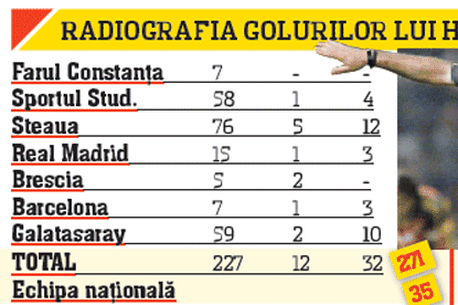 Întâlnire acum câteva luni între jurnalist și Hagi. „N-am văzut un clasament al golurilor marcate în toată cariera! Cred că sunt printre primii”. Hagi a greșit un pic. Statistica spune, sec și limpede, că el este fotbalistul român cu cele mai multe goluri marcate în competițiile oficiale, la echipe de club și la națională.