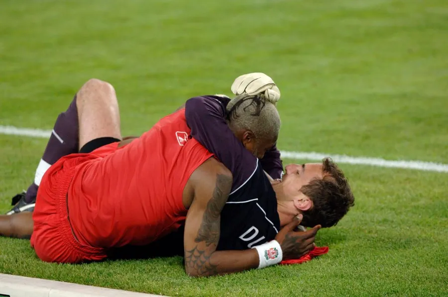 Jerzy Dudek, îmbrățișându-l pe Djibril Cisse după câștigarea Ligii Campionilor în 2005.