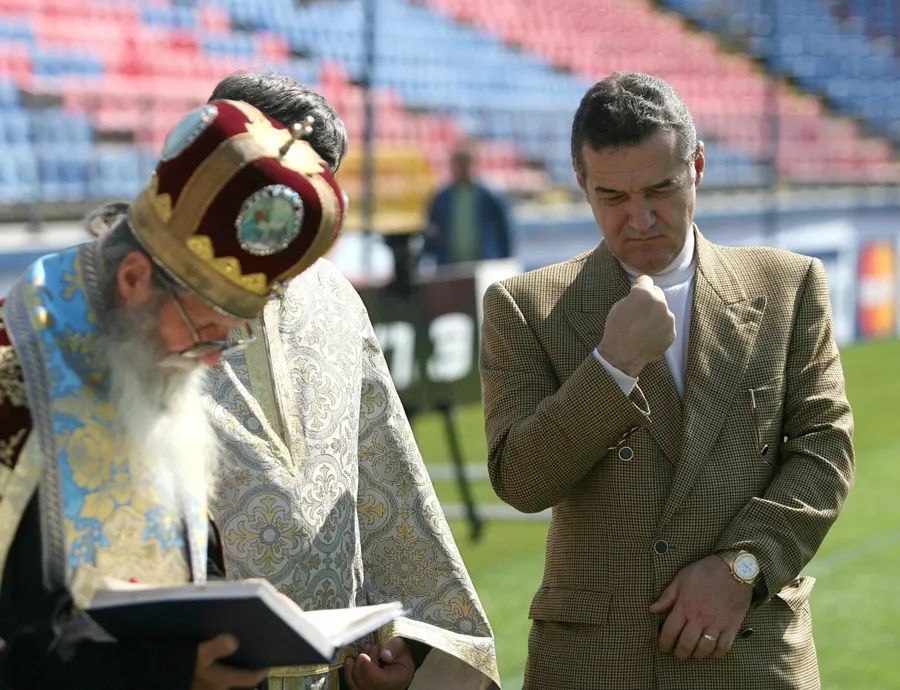 (Gigi Becali asculta slujba pentru sfințirea stadionului din Ghencea, la 25 septembrie 2006)