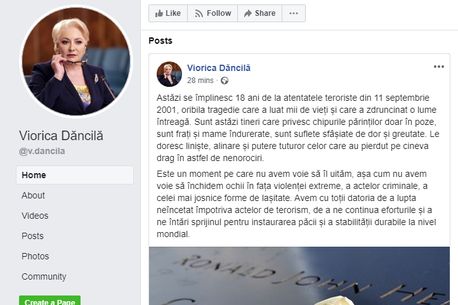 „Astăzi se împlinesc 18 ani de la atentatele teroriste din 11 septembrie 2001, oribila tragedie care a luat mii de vieți și care a zdruncinat o lume întreagă. Sunt astăzi tineri care privesc chipurile părinților doar în poze, sunt frați și mame îndurerate, sunt suflete sfâșiate de dor și greutate. Le doresc liniște, alinare și putere tuturor celor care au pierdut pe cineva drag în astfel de nenorociri„, a scris premierul Viorica Dăncilă pe pagina sa de socializare.