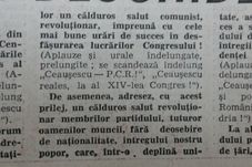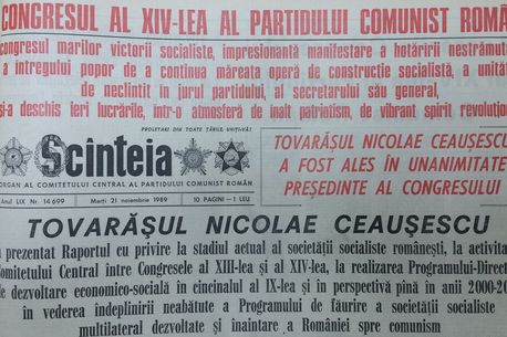Pentru comparație, vă oferim un pasaj din ziarul „Scînteia” din 21 noiembrie 1989, după cel de-al XIV-lea (și ultimul) Congres al PCR. Titlul „Tovarășul Nicolae Ceaușescu a fost ales în unanimitate președinte al Congresului” era urmat de textul în care se prezenta discursul conducătorului. „Stimați tovarăși, îmi revine marea cinste ca, din împuternicirea Comitetului Central, să declar deschise lucrările celui de-al XIV-lea Congres al Partidului Comunist Român. (Aplauze și urale puternice, prelungite; se scandează îndelung „Ceaușescu – P.C.R.!”, „Ceaușescu reales, la al XIV-lea Congres!”)”.