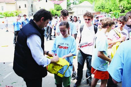 Pe terasa clădirii, un fel de tribună principală, o sută de elevi formează un goblen multicolor. Ochiurile sunt reprezentate de stegulețele ProSport, agitate de fiecare dată când jucătorul favorit izbește mingea de terenul advers, faze ce declanșează un cor asurzitor de goarne și o ploaie de confetti. În acest cadru fierbinte sosesc și invitații. Ionela Tîrlea și Ionuț Lupescu se fac părtași la bucuria copiilor care au dat poate pentru cateva minute sedentarismul provocat de laptop pe mișcarea în aer liber. Ionela are acum 33 de ani. Ionut e cu opt ani mai mare, dar trecerea timpului parcă i-a ocolit pe cei doi. Kaiserul intra ușor stingher pe poarta școlii, în care, în copilărie juca fotbal visând la echipa națională. Lupescu a locuit în copilărie pe o stradă adiacentă și cunoaște foarte bine locul.