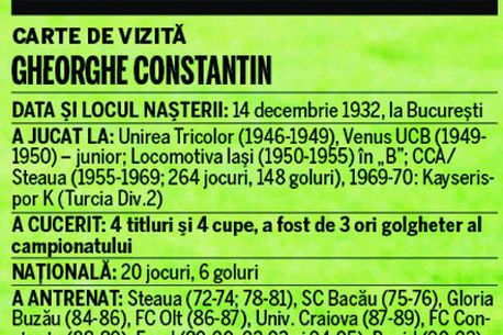O veste tristă a scuturat ieri fotbalul românesc. Gheorghe Constantin, cel supranumit „Profesorul", fost jucător de legendă al Stelei, a încetat din viață la vârsta de 77 de ani. Știrea s-a strecurat discret printre scandalurile zilei, însă cei care l-au cunoscut pe Gheorghe Constantin s-au oprit, pentru a vărsa o lacrimă la dispariția unui prieten. „Simt o durere fantastică în suflet, pentru că mi-a fost un coleg extraordinar. Am stat cu el 13 ani în cameră la Steaua și încă doi în Turcia. Este o mare pierdere", spune Emeric Ienei. „Țop" Voinescu, alt jucător de legendă al Stelei, își găsește cu greu cuvintele: „Îmi pare rău că viața e uneori prea scurtă pentru valorile sportive. Nu ne merităm soarta asta trecătoare. «Crăcănel», căci așa îi mai spuneam, a fost un mare fotbalist și un mare om". Vorbe din inimă și din tabăra „rivalilor". „A fost idolul meu, mai ales că a fost crăcănat ca și mine", mărturisește Cornel Dinu.