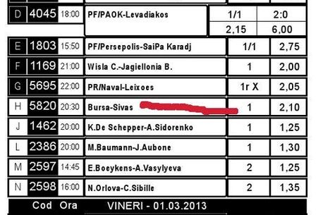 Bursa – Sivas 1 (0-1 scor final; de notat că cele două echipe s-au întâlnit săptămâna trecută de două ori, prima oară în Cupă, meci încheiat cu victoria lui Sivas. În campionat, ieri, Bursa a câștigat, însă pariorul a ales, din păcate pentru el, partida de joi)