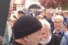 Oamenii s-au înghesuit să sărute icoana primită de Becali, mulți i-au pupat mâna, în timp ce alții îl complimentau.