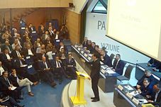 La ultima Adunare Generală a FRF, desfășurată anul trecut, în luna mai, singurul care a votat constant împotriva lui Burleanu (la pupitru) a fost Balaj (primul rând din dreapta, în sală, cu caronașul roșu ridicat)