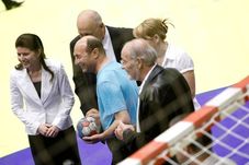 Băsescu nu a scăpat prilejul și a vrut să-și arate din nou calitățile de fost handbalist. Ca și în urmă cu doi ani, când Oltchim a câștigat Cupa Cupelor, Luminița Huțupan l-a provocat pe șeful țării să-i arunce la poartă. „Nu-ți mai trag, că mă lași să dau gol!”, i-a spus Băsescu. „Nu vă las să înscriți!, i-a răspuns bravul portar. În cele din urmă, președintele i-a înscris un gol pe bune, din două încercări, însă Luminița a apărat îmbrăcată ca de gală, în pantofi cu toc și rochie.