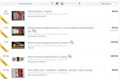 O diversitate a ofertei se observă și pe siteul olx.ro. Pe 2 octombrie, Andrei a postat anunțul conform căruia scoate la vânzare bilete la peluză (40 lei – preț inițial) pe care solicită 90 de lei. Meniul conține trei pagini în care sunt inserate mai bine de 60 de oferte. La tribuna 1 se pot achiziționa cu 400 lei cărțile de acces pe care vânzătorul a plătit doar 160 de lei, iar ofertele par a satisface fiecare cerință, chiar și pentru sectorul VIP pentru a-l vedea pe Victor Pițurcă. Totul depinde de șansă, de disponibilitatea de parlamentări, de proximitatea geografică și de cheful individului de a lăsa la preț. Pentru a vă face o imagine completă a modului în care comercianții își prezintă marfa sau (poate) chiar a cumpăra bilete puteți accesa siteurile mai sus menționate și tastați bilete România – Ungaria. Puteți doar să vă informați sau să intrați cât mai adânc în pânza de păianjen țesută de bișnițarii-internauți.