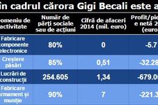 În continuare, celelalte afaceri pe care le are Gigi Becali par să fie susținute din banii produși de clubul de fotbal. Datele de la Registrul Comerțului arată că Becali este acționar la aceleași patru companii pe care le conducea și anul trecut. Rezultatele de la Ministerul Finanțelor pentru anul 2014 arată faptul că toate aceste patru companii – Romes, Avicola Iași, Arcom și Uzina Mecanică Drăgășani – i-au produs lui Becali o pierdere netă de 938.326 euro. Dacă în 2013 una dintre aceste companii – Avicola Iași – producea un profit de 122 de mii de euro, în 2014 toate cele patru au fost pe minus.