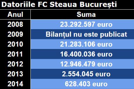 Între 2012 și 2013, datoriile Stelei au scăzut de la 12,94 milioane de euro la 2,55 milioane de euro, conform datelor de la Ministerul de Finanțe. Pentru că nu putem vorbi de datorii la stat, situație în care Steaua nu și-ar fi primit licența, rezultă faptul că diminuarea s-a datorat plății datoriilor către Gigi Becali, cel care spunea în declarația de avere semnată în ianuarie 2013 că are de recuperat suma de 10,2 milioane de euro de la club. În 2014, Steaua figurează în datele de la Ministerul de Finanțe cu datorii de numai 628.000 de euro.