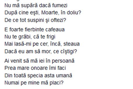 Ca o coincidență nefericită, în ultima sa postare de pe Facebook, în urmă cu fix o săptămână, „Tribunul” parcă a prevestit nenorocirea care s-a abătut asupra sa. Acesta a împărtășit cu prietenii virtuali un poem în care purta un dialog imaginar cu moartea.