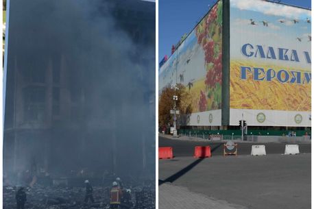 Clădirea a fost ocupată de protestatari în timpul evenimentelor violente și a suferit atât din cauza flăcărilor, cât și din pricina mai multor explozii care i-au afectat structura de rezistență. Dacă în stânga imaginii o puteți vedea așa cum arăta în februarie, în prezent clădirea este acoperită cu o pânză uriașă pentru a masca pereții găuriți și afumați de la expunerea lungă la foc. Pietrele pe care le puteți vedea în imaginea din stânga au fost curățate de pe Bulevardul Khreshchatyk, cea mai mare și importantă stradă din Kiev. Singurul lucru rămas întreg este ceasul din turnul de pe acoperiș, cel care dă ora exactă în una dintre cele mai aglomerate zone din capitală.