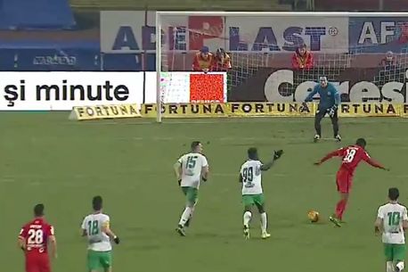 Essombe greșește preluarea, dar fundașii centrali Mamele (15) și Tincu (4) nu depun mari eforturi să-l ajungă