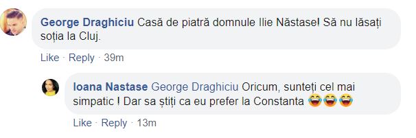 Răspunsul Ioanei Năstase nu s-a lăsat cu mult așteptat: „Oricum sunteți cel mai simpatic! Dar să știți că eu prefer la Constanța!”.