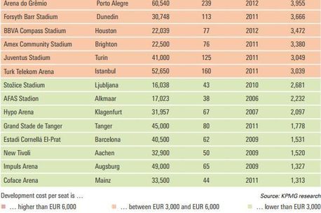 Decizia de a stabili capacitatea în locuri a unei arene influențează drastic costurile de producție, susțin autorii studiului. Acest lucru este datorat în mare măsură unui acoperiș mai mare, costurilor crescute ale structurilor de rezistență care susțin tribunele, lifturilor și locurilor de parcare. Mai departe, pentru a putea fi rentabil, un stadion mai mare cere un număr crescut de locuri premium. Astfel, Național Arena ocupă locul 12 într-un top alcătuit din 28 de stadioane construite din 2005 și până în 2013, cu un cost/scaun de 4.209 euro. Surclasat clar de Wembley Stadium din Londra (10.137 euro/scaun), Friends Arena din Stockholm (6.000 euro/scaun) sau Donbass Arena din Donețk (5.706 euro/scaun), stadionul din București s-a dovedit mai scump decât alte arene cu renume precum Juventus Stadium din Torino (3.049 euro/scaun) sau Turk Telekom Arena din Istanbul (3.039 euro/scaun). Cel mai ieftin stadion inclus în acest capitol al studiului KPMG este Coface Arena din Mainz cu un cost de 1.313 euro/scaun la o capacitate de 33.500 de locuri, adică un cost de producție total de 44 de milioane de euro.